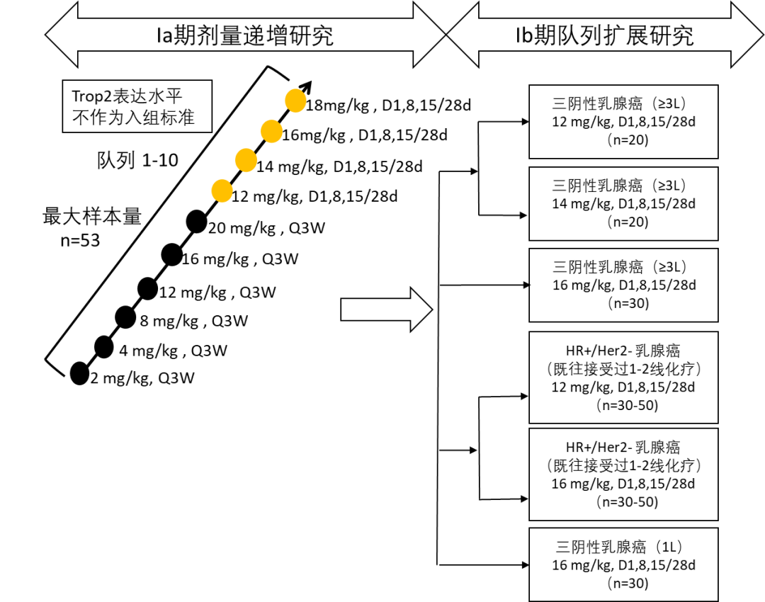 該研究為一項(xiàng)開(kāi)放、劑量遞增及隊(duì)列擴(kuò)展I/II期研究。符合條件的患者是18-75周歲的男性/女性、ECOG狀態(tài)0-1、經(jīng)組織學(xué)或細(xì)胞學(xué)確診為晚期或轉(zhuǎn)移性實(shí)體瘤,且無(wú)有效的標(biāo)準(zhǔn)治療或患者對(duì)標(biāo)準(zhǔn)治療不耐受。對(duì)于通過(guò)完全切除和(或)放療治療后保持穩(wěn)定或出現(xiàn)改善的CNS轉(zhuǎn)移的患者也可納入研究。符合條件的患者按照規(guī)定的給藥方案靜脈滴注給藥(每21天或28天為一個(gè)周期),接受ESG401治療直到疾病進(jìn)展、或出現(xiàn)不可耐受的毒性、或受試者撤回同意、或受試者死亡、或方案規(guī)定的其他原因。