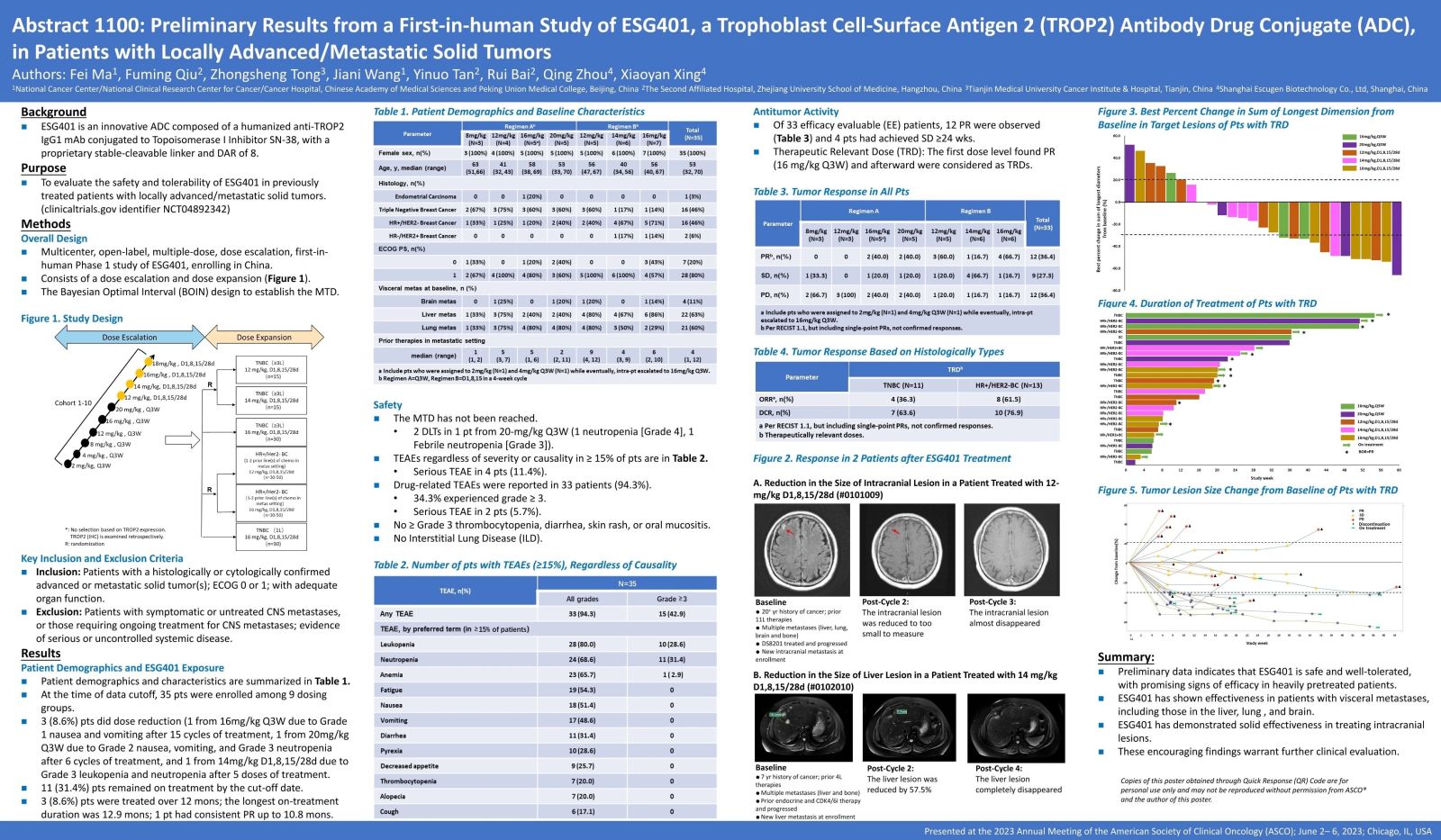 研究題目:Preliminary results from a First-in-human Study of ESG401, a Trophoblast Cell-Surface Antigen 2 (TROP2) Antibody Drug Conjugate (ADC), in Patients with Locally Advanced/Metastatic Solid Tumors.