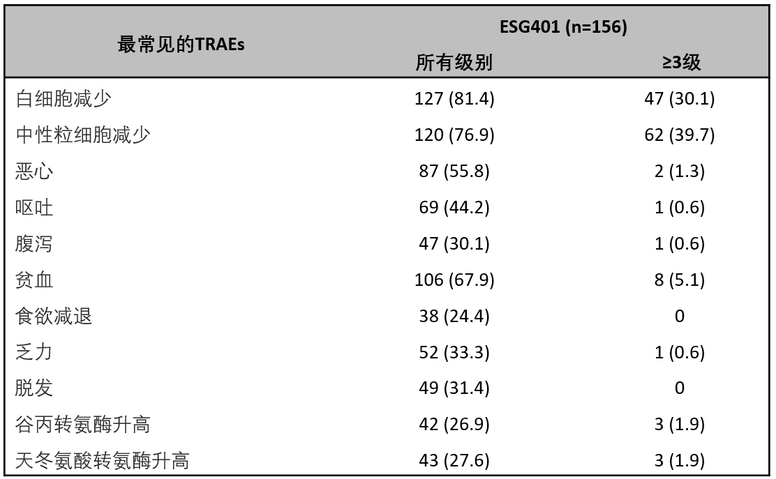 安全性與既往的報告一致,沒有發(fā)現(xiàn)新的或非預期的安全信號。最常見的≥3級與研究藥物相關的不良事件(TRAEs)包括中性粒細胞計數(shù)降低、白細胞計數(shù)降低。