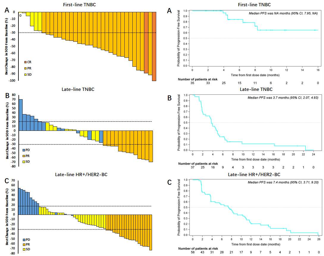 左圖:(A)一線TNBC、(B)晚期TNBC和(C)晚期HR+/ HER2-BC患者靶病變SOD最佳百分比變化的瀑布圖。右圖:Kaplan-Meier圖顯示(A)一線TNBC、(B)晚期TNBC和(C)晚期HR+/ HER2-BC患者的無進展生存期。