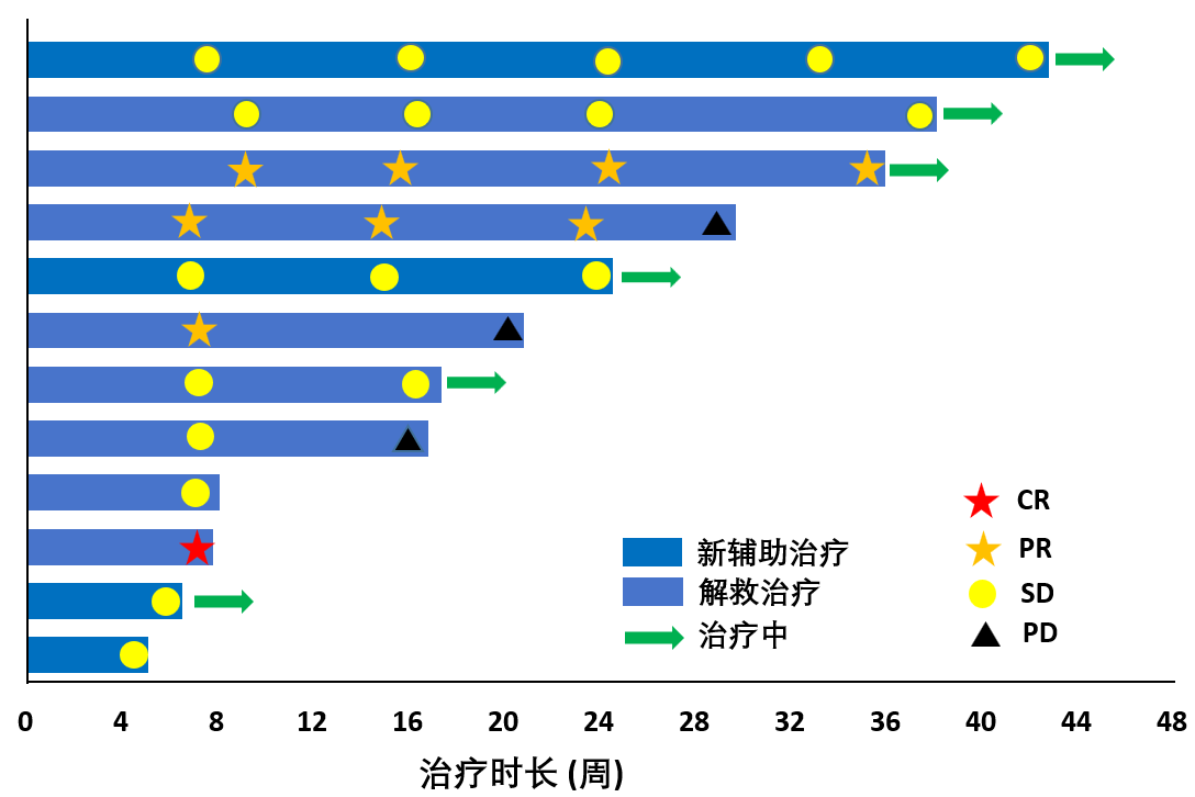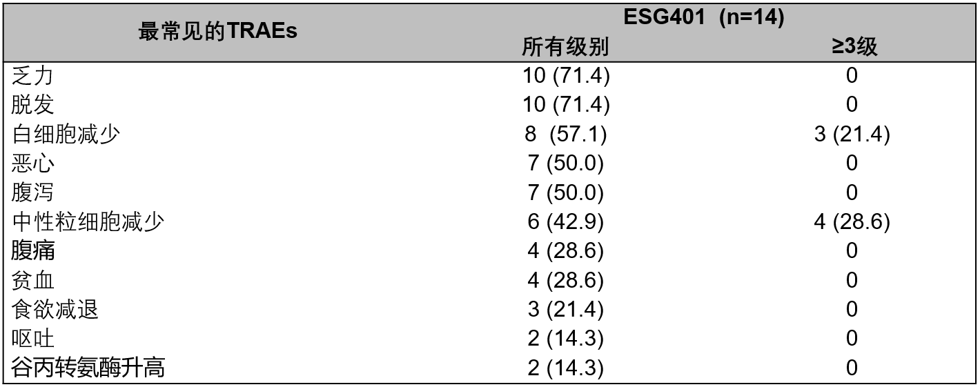 截至2025年1月22日,14名患者接受了至少1次ESG401治療。入組患者的年齡中位值為48.5歲(范圍:31,65);男性和女性各為7例(50%)?;€時43%的患者伴有肺轉移,7%的患者伴有肝轉移,29%的患者伴有腦轉移;79%的患者既往接受過手術,43%的患者接受過放療,36%的患者接受過化療,14%的患者既往未接受過治療。