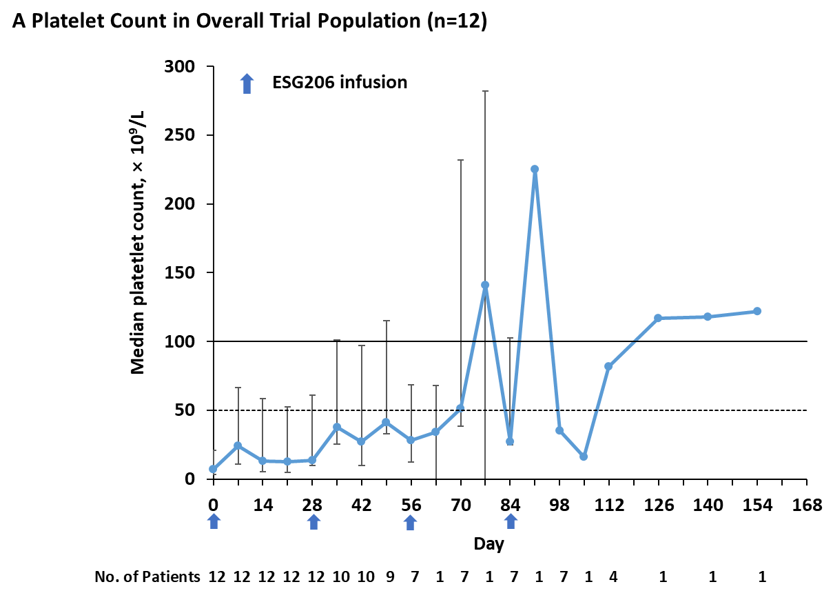 截至2025年10月23日,共12例受試者接受了至少一劑ESG206治療(中位年齡[范圍]為40[25-72]歲;其中3名男性[25%])。受試者既往接受ITP治療線數(shù)中位數(shù)為4(范圍1-9)。其中7例受試者接受ESG206單藥治療,3例聯(lián)合使用皮質(zhì)類固醇(CS)、1例聯(lián)合血小板生成素受體激動(dòng)劑(TPO-RA)、1例聯(lián)合使用CS與TPO-RA作為背景治療。