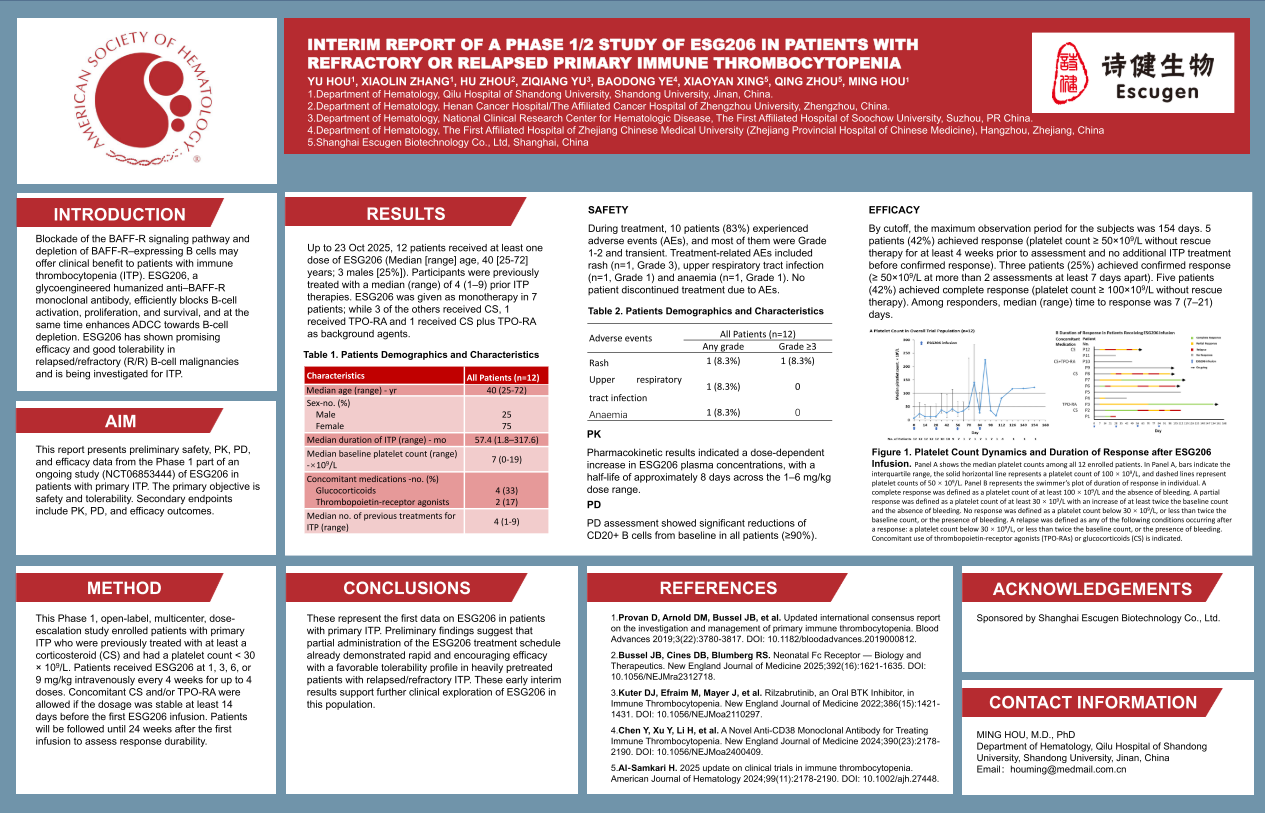 2025年12月7日,詩健生物在第67屆ASH會(huì)議上以Poster形式報(bào)告了ESG206(抗BAFF-R單抗)治療復(fù)發(fā)/難治性原發(fā)免疫性血小板減少癥 I/II期臨床研究的最新數(shù)據(jù)。